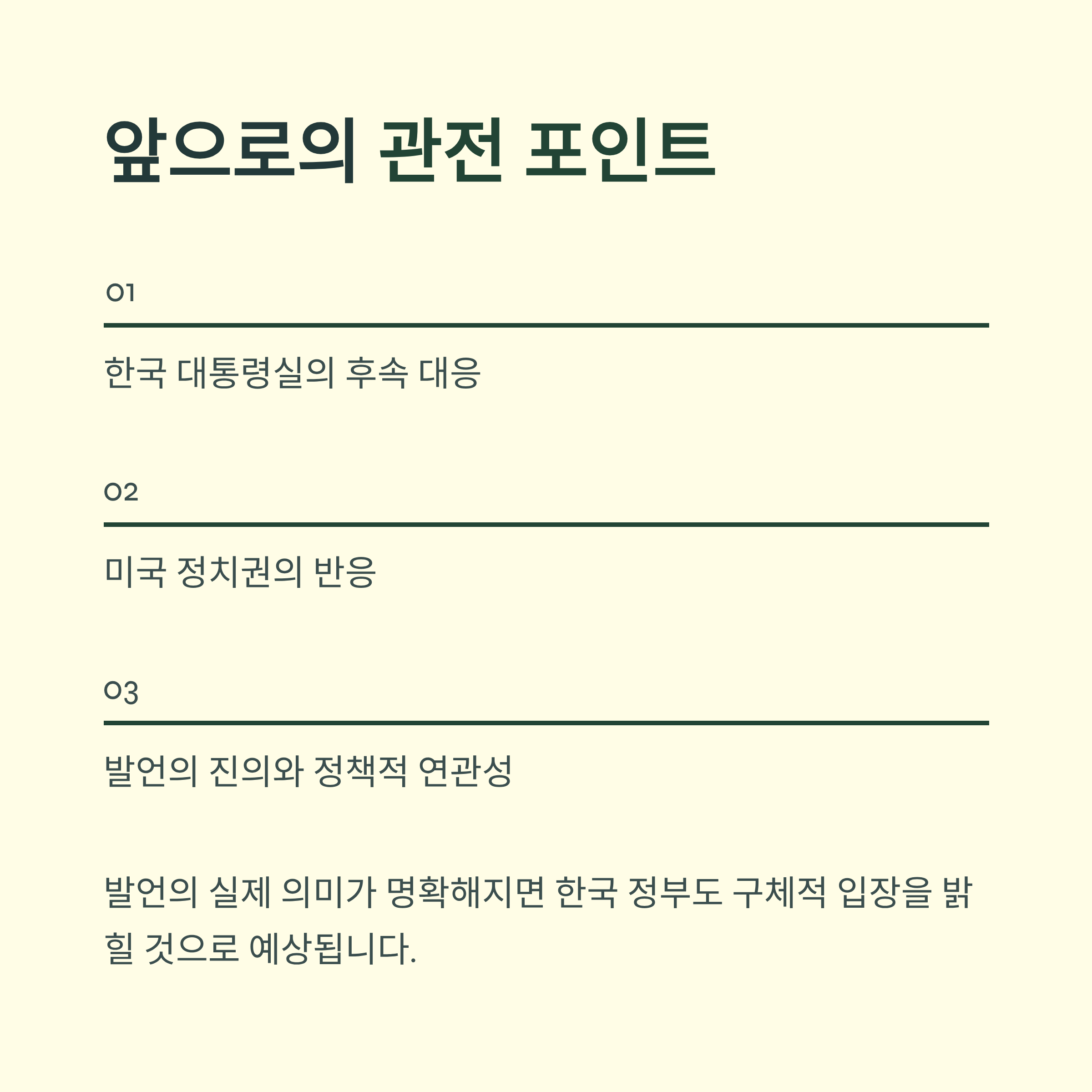 한국 대통령실의 후속 대응과 미국 정치권의 반응이 향후 핵심 관전 포인트입니다.
