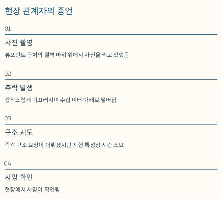 | 사고 원인 | 사진 촬영 중 추락, 안전시설 미비 |