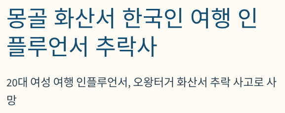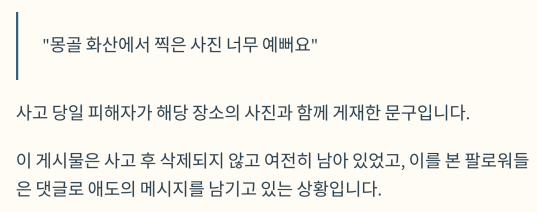 팔로워 수만 명을 보유한 20대 한국인 여행 인플루언서가 몽골의 유명 화산 관광지에서