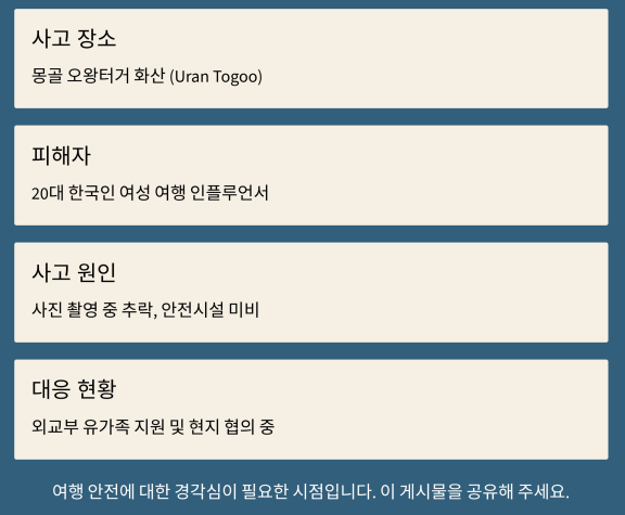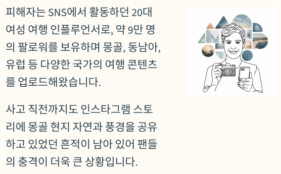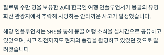 해당 인플루언서는 SNS를 통해 몽골 여행 소식을 실시간으로 공유하고 있었으며,