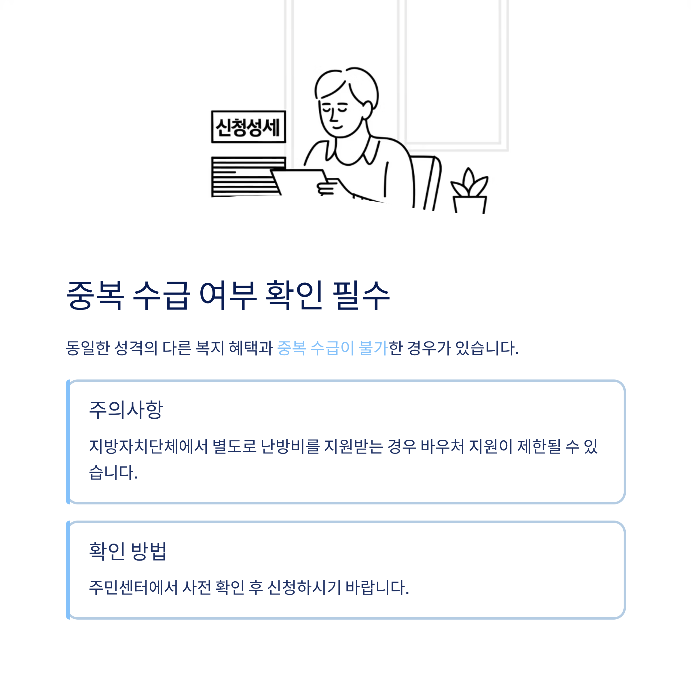 예를 들어 지방자치단체에서 별도로 난방비를 지원받는 경우라면 바우처 지원이 제한될 수 있어요.