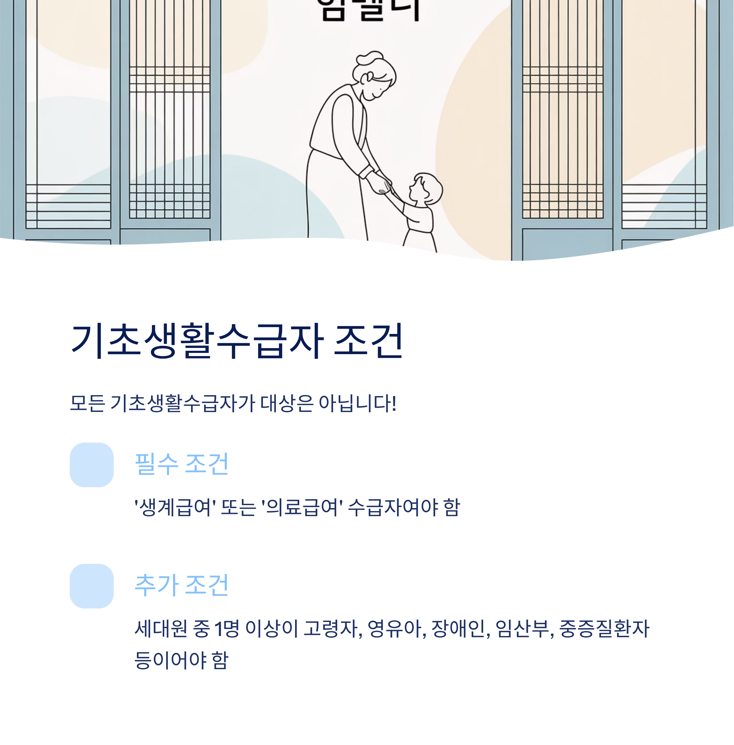 반드시 '생계급여' 또는 '의료급여' 수급자여야 하며, 그중에서도 '세대원 중 1명 이상'이 아래 조건을 만족해야 해요.