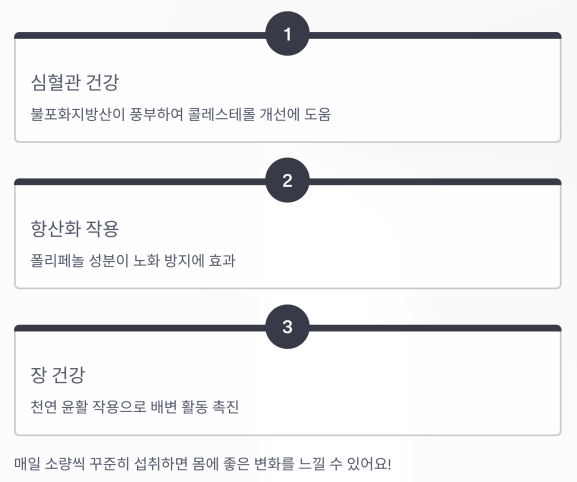 | 항산화 작용 | 폴리페놀 성분이 노화 방지에 효과 |
