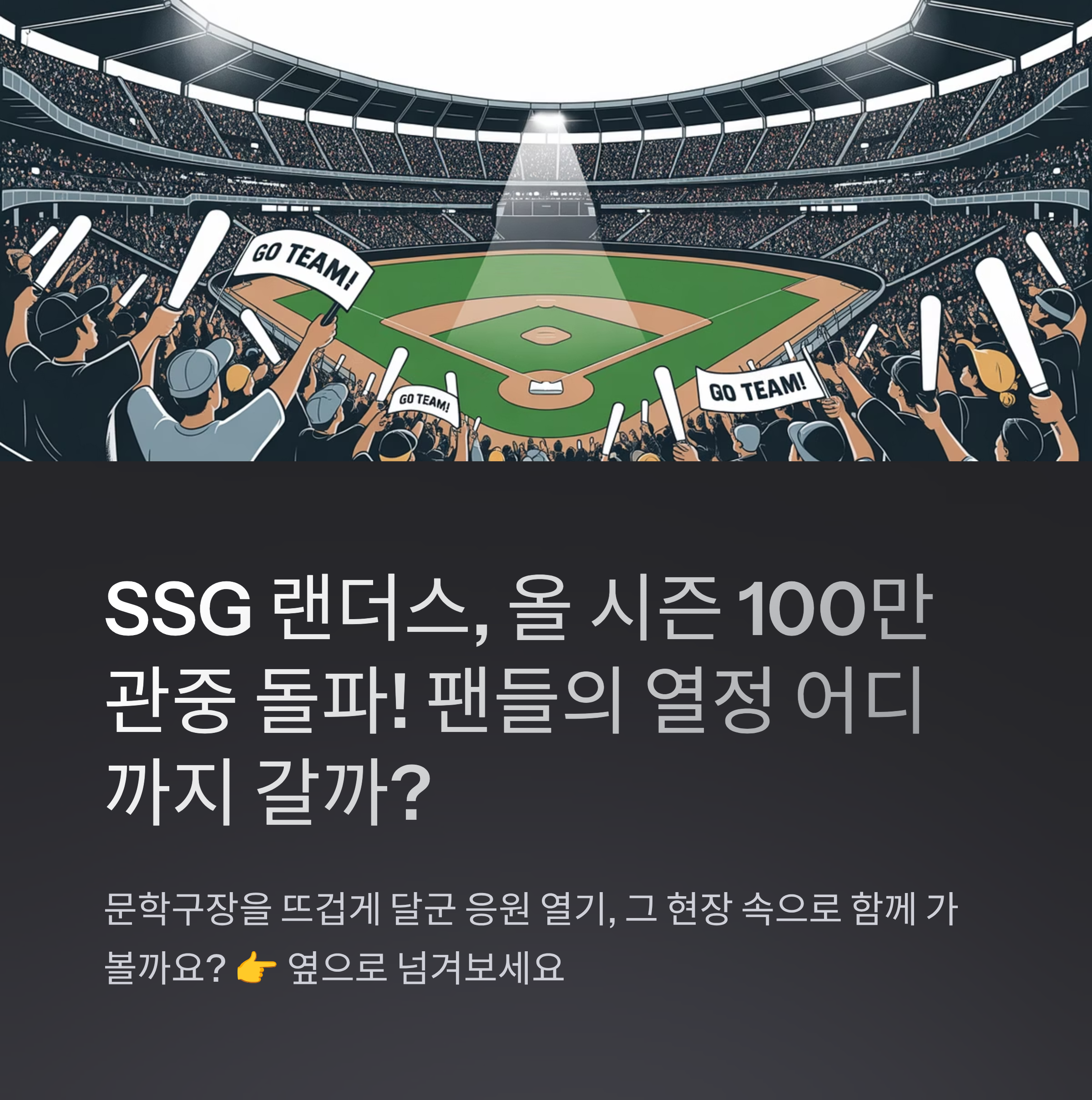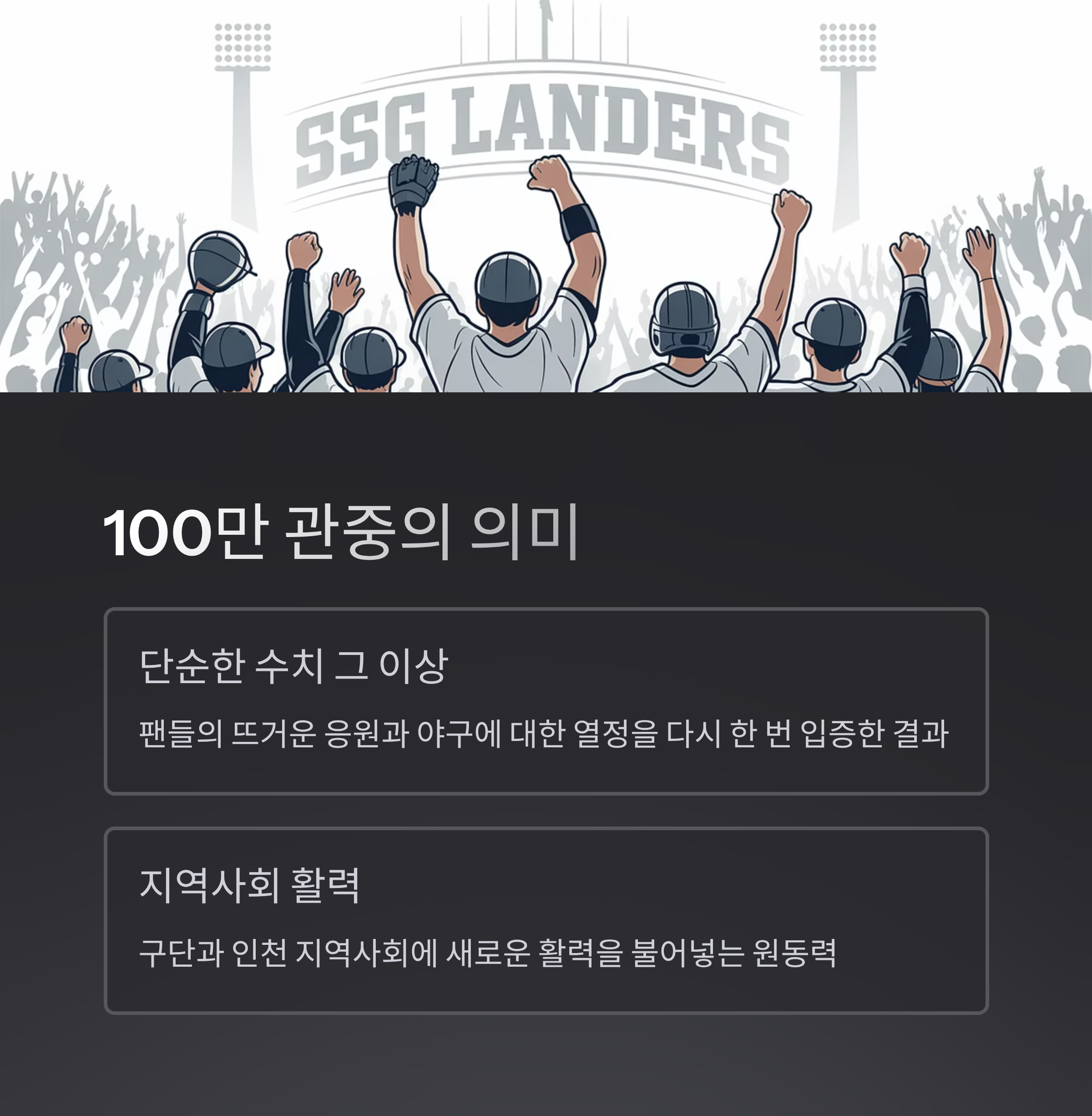 이 글에서는 SSG의 100만 관중 달성 의미, 관중 트렌드, 그리고 앞으로의 기대감을 담아봤습니다.