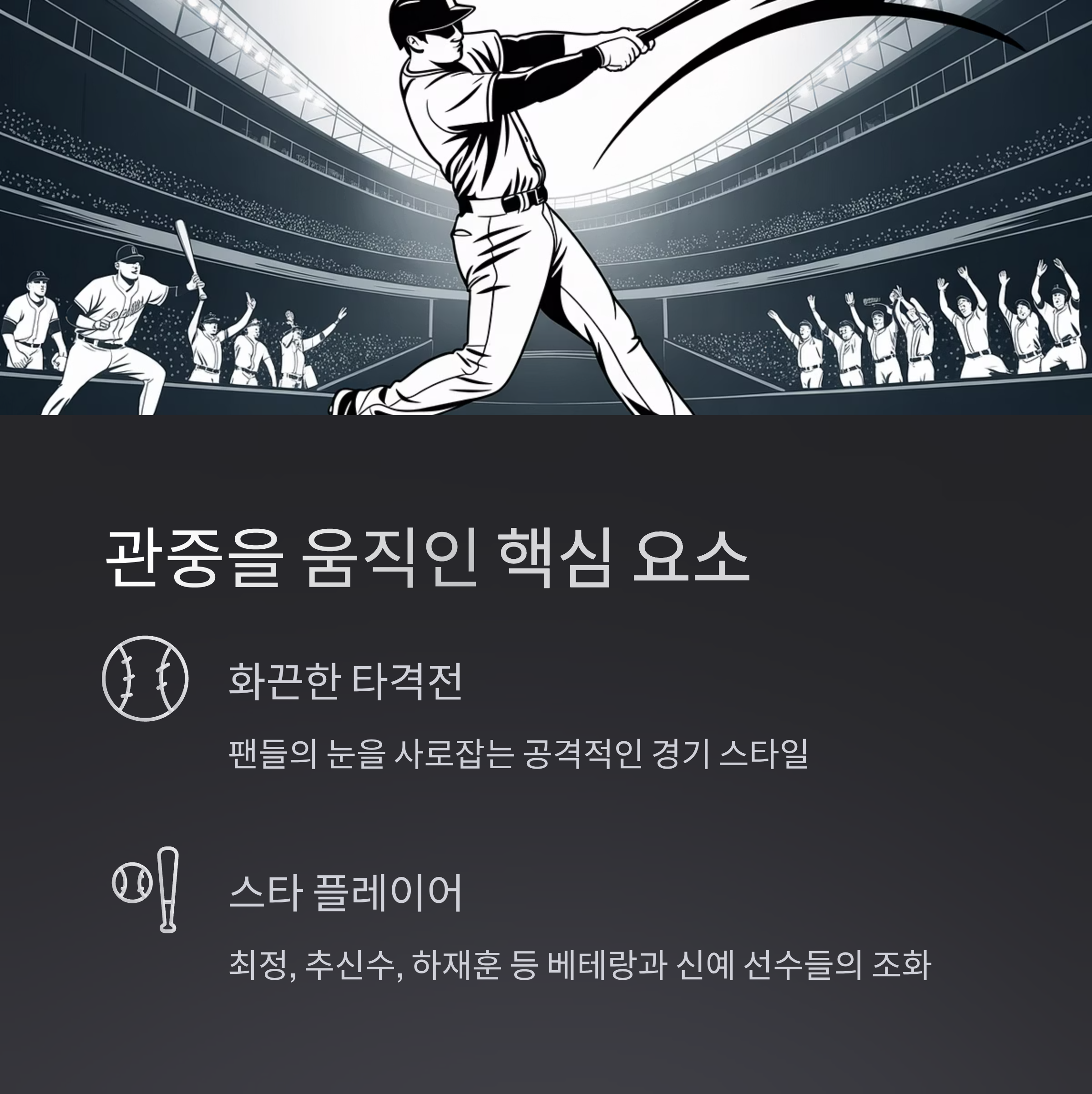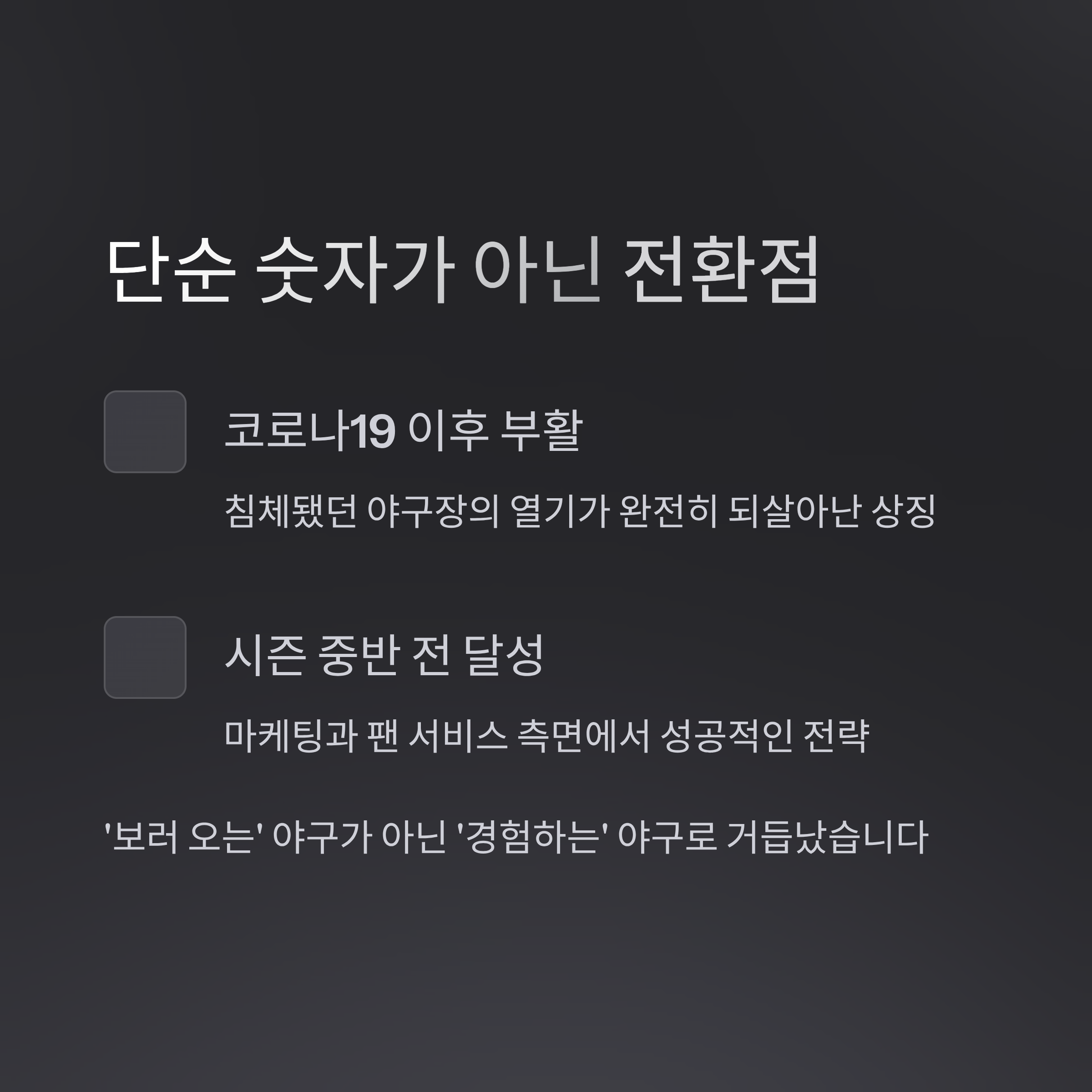 즉, 단순히 '보러 오는' 야구가 아니라, '경험하는' 야구로 거듭났다는 뜻입니다.